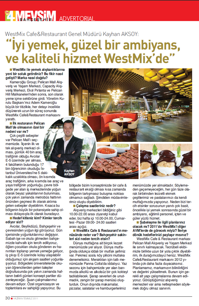 Kameroğlu Group bünyesinde hizmete giren WestMix Cafe & Restaurant ’ın ilk şubesi Pelican Mall Alışveriş ve Yaşam Merkezi’nde açıldı.