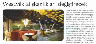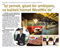 WestMix Cafe & Restaurant, zengin menu seçenekleri ve ödüllü şefinin yönetimindeki iddialı mutfağında; misafirlerine Türk damak tadının ünlü ve lezzetli seçimlerinin yanı sıra dünya mutfaklarından da seçkin örnekler sunuyor. Bölgenin en geniş açık teras alanlı restoranı özelliğini taşıyan WestMix Cafe & Restaurant konfor ve şıklığı bir arada bulunduran ambiyansı ile damaklara olduğu kadar gözlere de hitap etmeyi amaçlıyor.